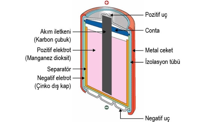 Bir bataryanın içindeki temel güç ünitesine hücre denir ve üç ana elemandan oluşur. İki elektrot (elektrik terminalleri) ve bunların arasında elektrolit denilen bir kimyasal vardır. Güvenliğimiz için, bunlar genellikle metal veya plastik bir dış kılıf içinde paketlenir. İçinde bulunan elektrotlara bağlı dış tarafta artı (pozitif) ve eksi (negatif) ise işaretlenmiş iki tane elektrik terminali vardır.