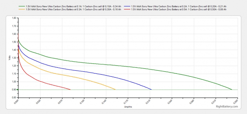 Çinko karbon hücresi kapasitesi 400-1700 mAh ‘ a kadardır. Özgül enerjisi 33-42 Wh/kg ‘ dir.
